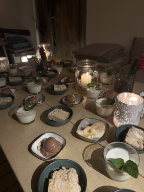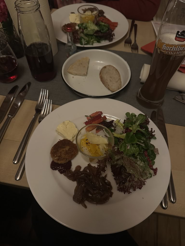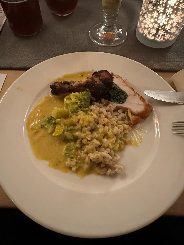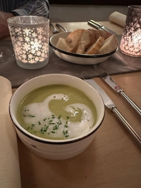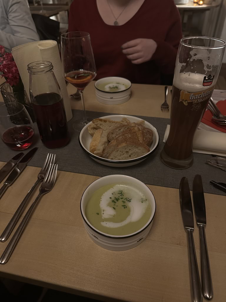 Schon der Empfang hat Lust auf mehr gemacht: Mit einem Aperitif in der Hand konnten wir entspannt ankommen und in den Abend starten. Danach ging es kulinarisch direkt weiter mit einer Suppe, die den perfekten Einstieg gemacht hat. Anschließend wurden wir mit einem liebevoll angerichteten Vorspeisenteller verwöhnt – voll mit allerlei leckeren Kleinigkeiten, bei denen wirklich für jeden etwas dabei war.